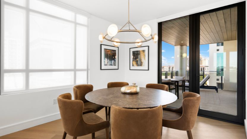 Dining area with Restoration Hardware furnishings, offering an elegant setting and balcony views.
