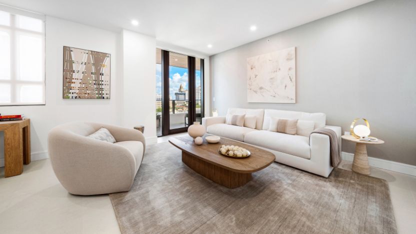 Sky Residence C living room featuring the curated Restoration Hardware furniture package.