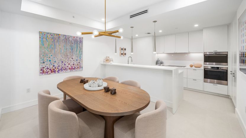 Sky Residence C kitchen & dining area, elegantly furnished with the Restoration Hardware package.