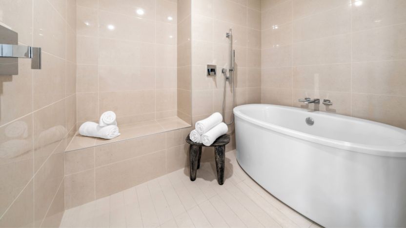 Sky Residence D primary bathroom featuring a luxurious tub and refined design details.