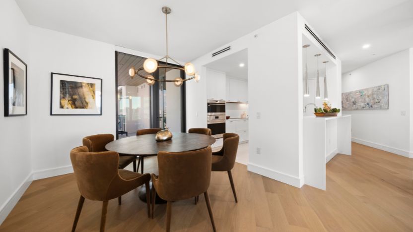 Sky Residence C kitchen & dining area, elegantly furnished with the Restoration Hardware package.