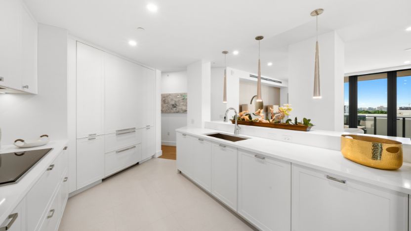Sky Residence D kitchen with elegant open view to the living room and balcony.