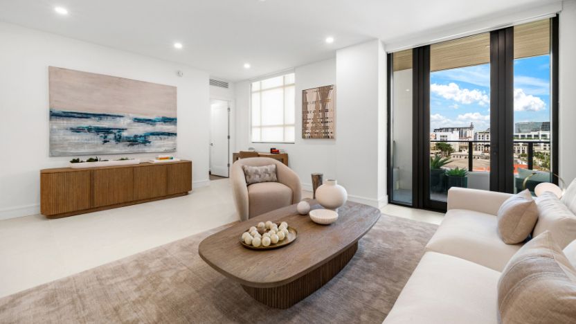 Sky Residence D living room with Restoration Hardware furnishings and stunning balcony views.